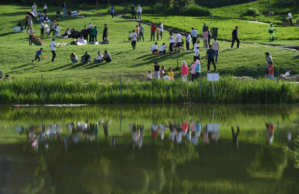 2020年8月19日,游人在位于延安市南泥湾景区的湿地公园游玩赏景。 新华社发(祁小军 摄)