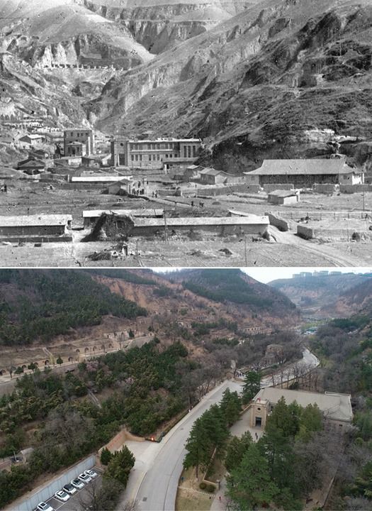 这是一张拼版照片,上图为:1943年拍摄的延安杨家岭——抗日战争时期党中央所在地(吴印咸摄);下图为:2021年4月21日拍摄的延安杨家岭革命旧址(无人机照片,新华社记者张博文摄)。 新华社发
