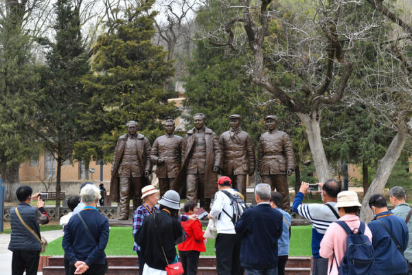 2021年3月29日,参观者在延安市张思德广场进行现场教学活动。 新华社记者 张博文 摄