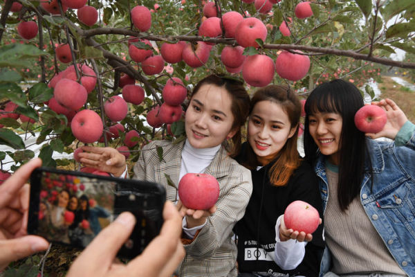 2019年10月22日,游客在陕西省延安市志丹县双河镇李家湾村果园拍照留影。 新华社记者 陶明 摄